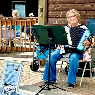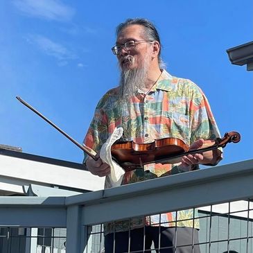 Sam on Violin, Lisa on Tambourin, Ian on Guitar, and Linda on Accordion create an unlikely combination. (Accordions had not been created when this piece was written!!!)